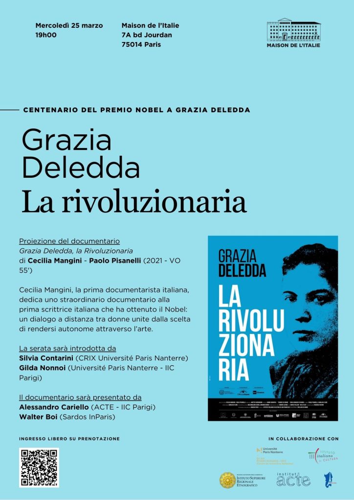À l’occasion du centenaire de la remise du prix Nobel pour la littérature à Grazia Deledda, la Maison de l’Italie a le plaisir d’accueillir la projection du documentaire Grazia Deledda, la Rivoluzionaria (Grazia Deledda, la révolutionnaire, 2021, 55′, VO) de Cecilia Mangini et Paolo Pisanelli.