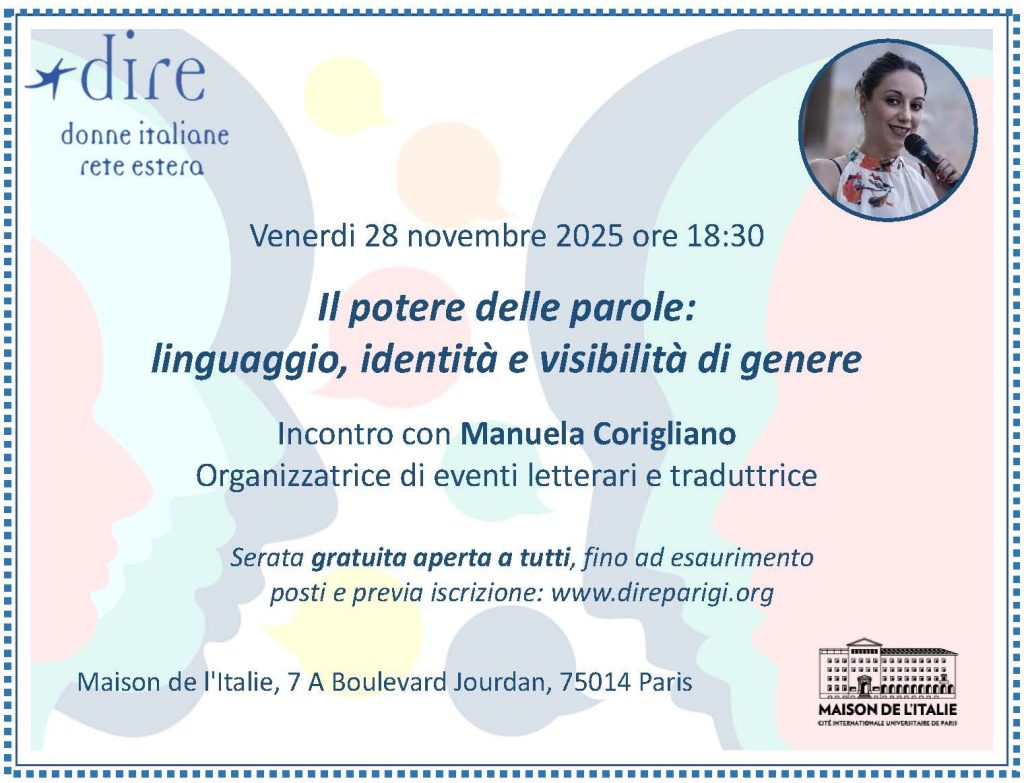DIRE (Donne italiane rete estera, réseau de femmes italiennes à l’étranger) organise la rencontre « Le pouvoir des mots : langage, identité et visibilité de genre », conçue et animée par Manuela Corigliano.